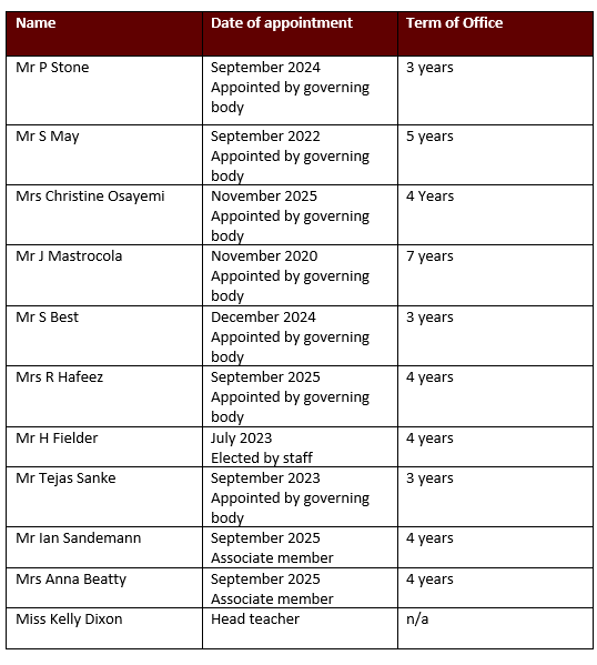 All governors are appointed according to the skills required within the Governing Body and their term of office is normally four years (apart from Associate Members which can be a shorter period of time). A skills audit is undertaken annually.